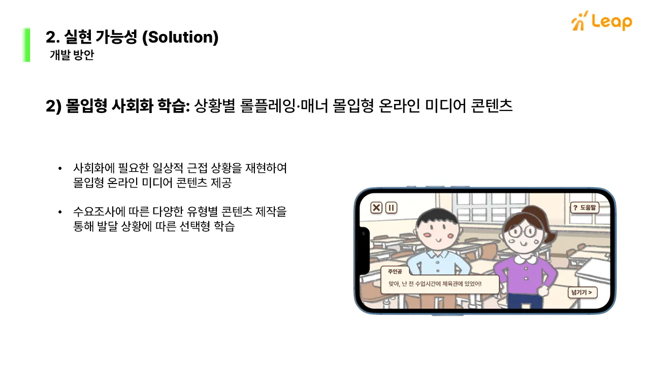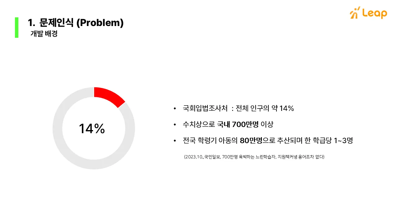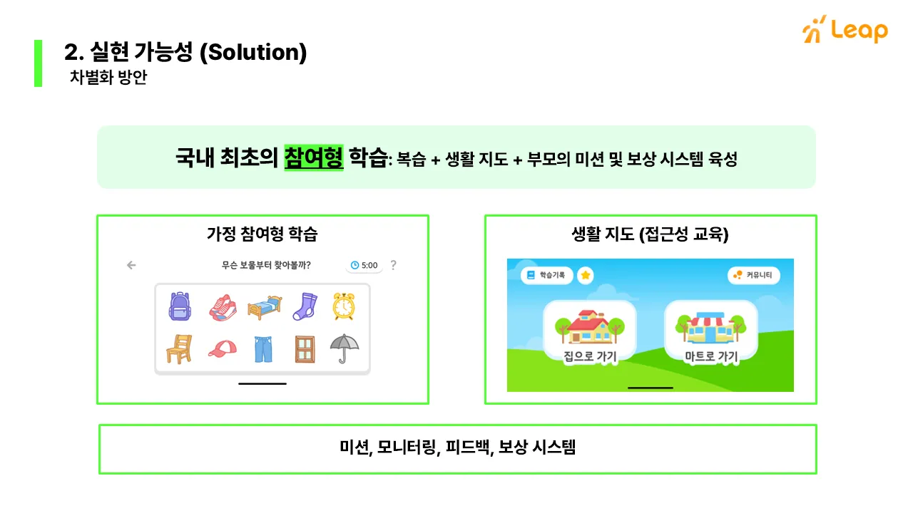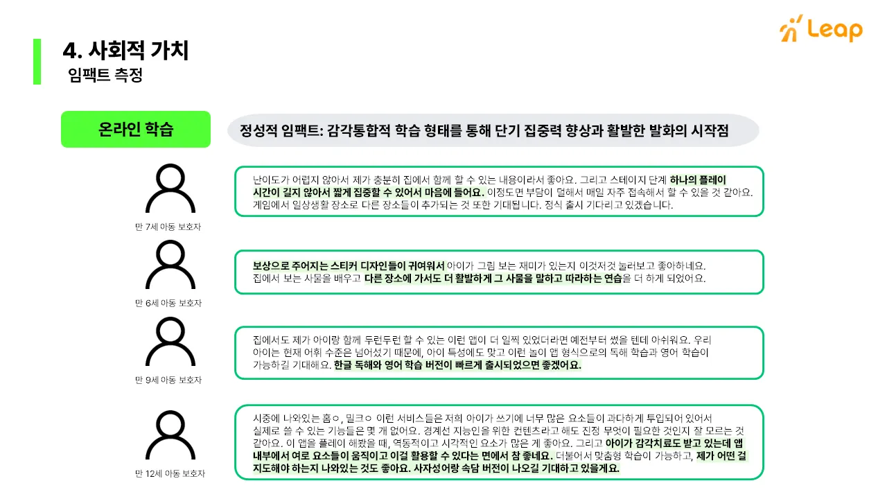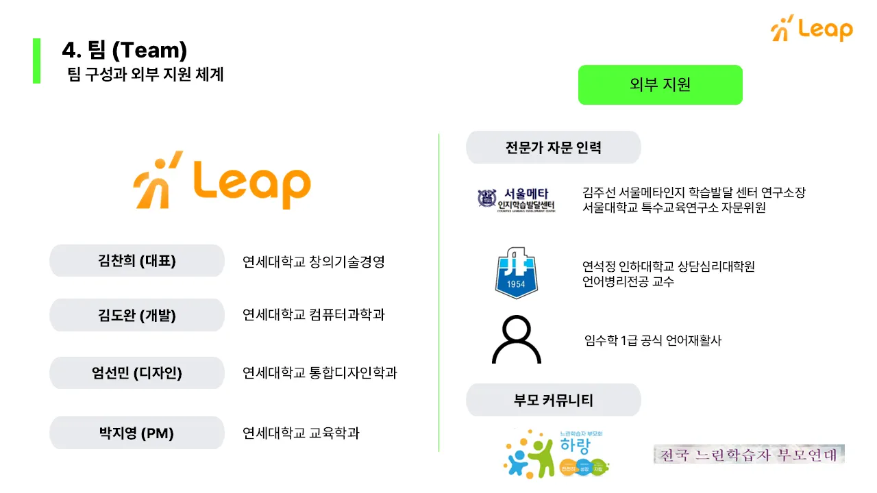 Leap 팀이 추구하는 사회적 가치는 “모두가 함께 건강하고 교육적 평등을 이루는 삶”입니다. 이러한 가치는 저희가 타겟하는 경계선 지능인 자녀들에게 분명히 선한 영향을 미칠 수 있는 효과적이고도 실질적으로 유용한 결과물을 창출할 것이라고 기대합니다.