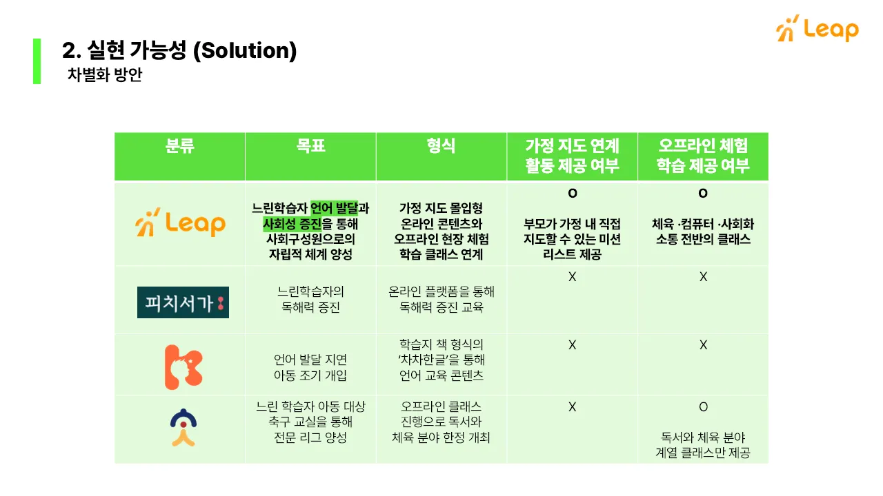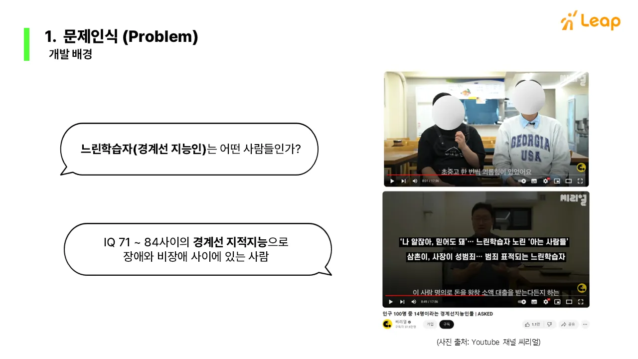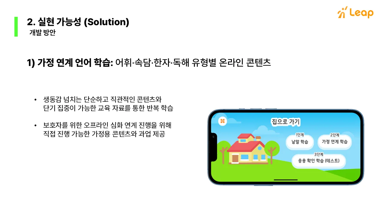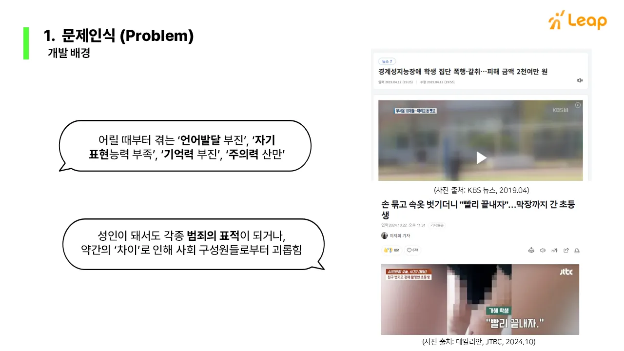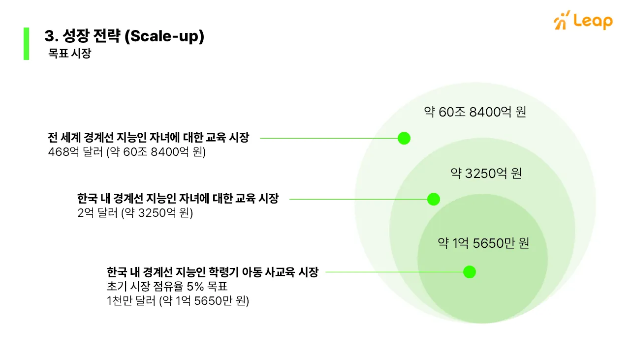 Leap 팀이 추구하는 사회적 가치는 “모두가 함께 건강하고 교육적 평등을 이루는 삶”입니다. 이러한 가치는 저희가 타겟하는 경계선 지능인 자녀들에게 분명히 선한 영향을 미칠 수 있는 효과적이고도 실질적으로 유용한 결과물을 창출할 것이라고 기대합니다.