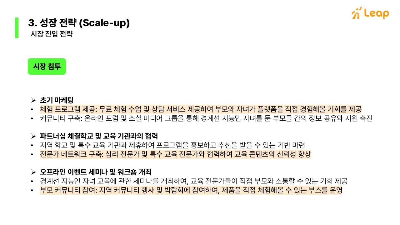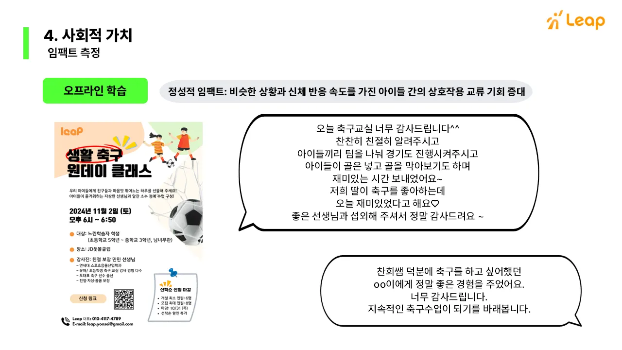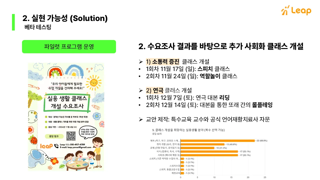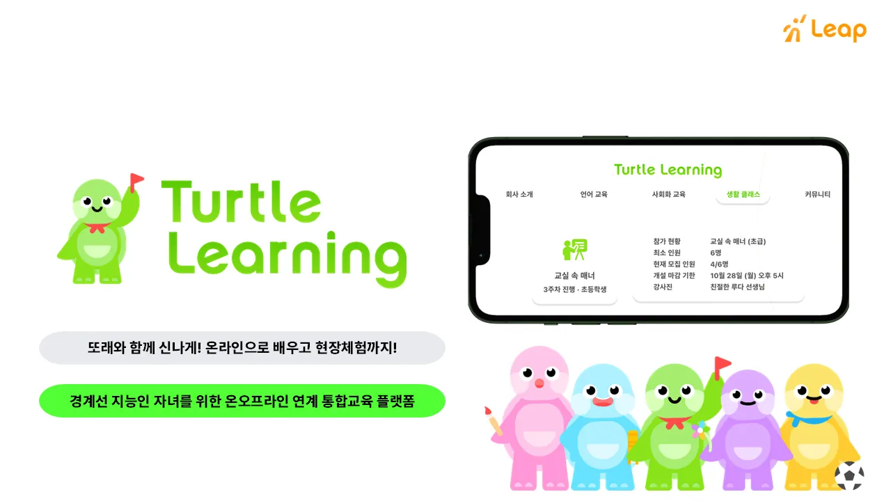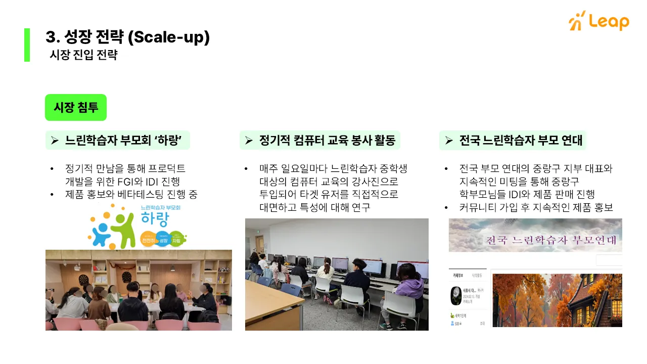 Leap 팀이 추구하는 사회적 가치는 “모두가 함께 건강하고 교육적 평등을 이루는 삶”입니다. 이러한 가치는 저희가 타겟하는 경계선 지능인 자녀들에게 분명히 선한 영향을 미칠 수 있는 효과적이고도 실질적으로 유용한 결과물을 창출할 것이라고 기대합니다.