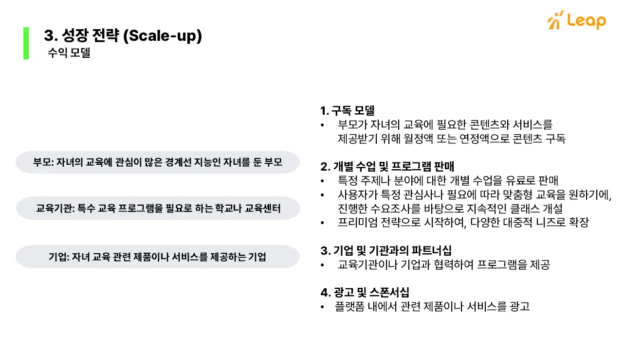 그리고 스펙트럼이 넓은 경계선 지능인 특성상, 초등학교 저학년, 초등학교 고학년, 중학교, 고등학교 재학과 개인의 지적 지능에 따라 필요한 학습의 종류가 모두 상이합니다. 느린학습자 자녀를 둔 학부모 37명을 대상으로 설문을 진행한 결과, 중학교에 재학 중인 자녀를 둔 부모의 93%는 영어, 과학실험, 한자에 대한 학습 컨텐츠 니즈가 매우 컸습니다. 유저의 학습 능력과 발달 상황에 따라 필요한 교육이 매우 다르기에, 다양한 종류의 학습 컨텐츠를 유료로 판매하여 선택형 학습과 기술을 통한 맞춤형 학습이 가능하도록 합니다.