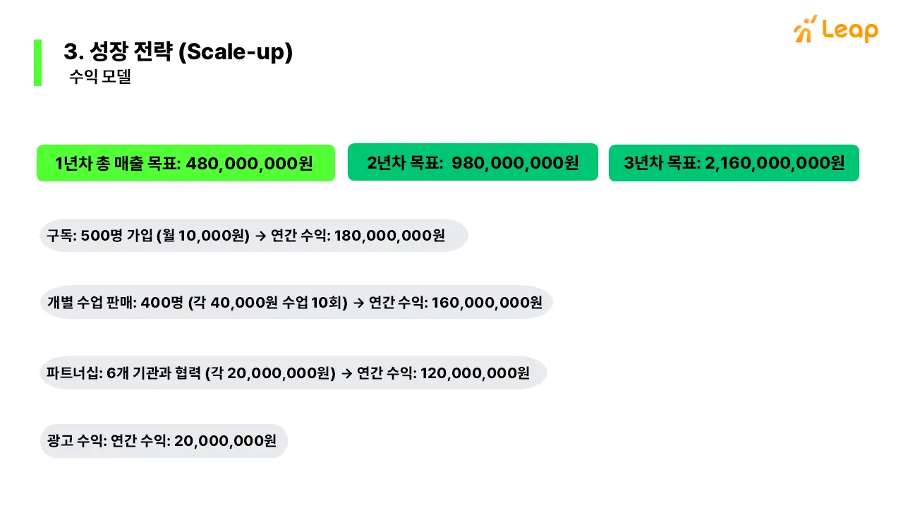 수익 모델은 크게 온라인 학습 구독형, 생활 클래스 개별 수업 판매, 파트너십 기관 협력, 플랫폼 내 광고 수익으로 창출하고자 합니다. 1년차 총 매출 목표는 4억 8천만원입니다.