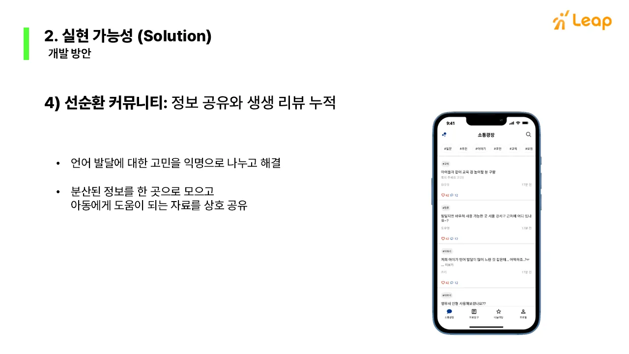 이를 통해 부모님들은 서로의 경험과 노하우를 나누며 아이들에게 더 나은 교육과 언어 치료 환경을 제공하는 데 도움을 받을 수 있을 것입니다. 커뮤니티에서는 언어학습을 돕는 자료, 전문가의 조언 등을 이용자들이 서로 주고받을 수 있도록 커뮤니티 플랫폼을 제공합니다. 결국 해당 커뮤니티는 플랫폼을 사용하는 이용자들이 정보를 공유하고 리뷰가 누적되면서 선순환 효과를 보이며 락인될 수 있는 기대효과를 가집니다.