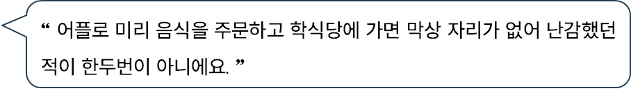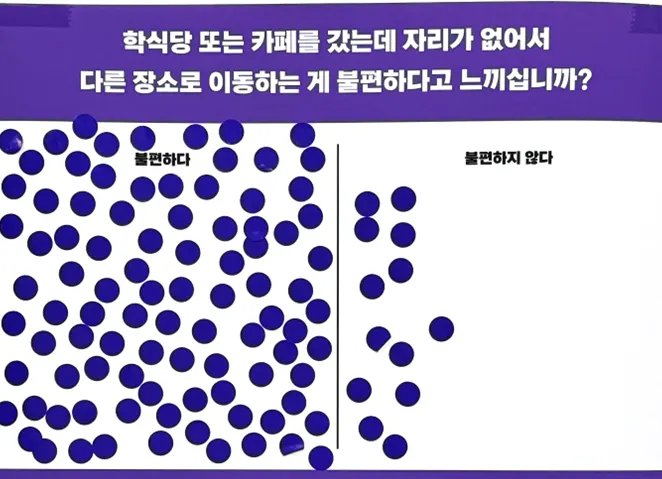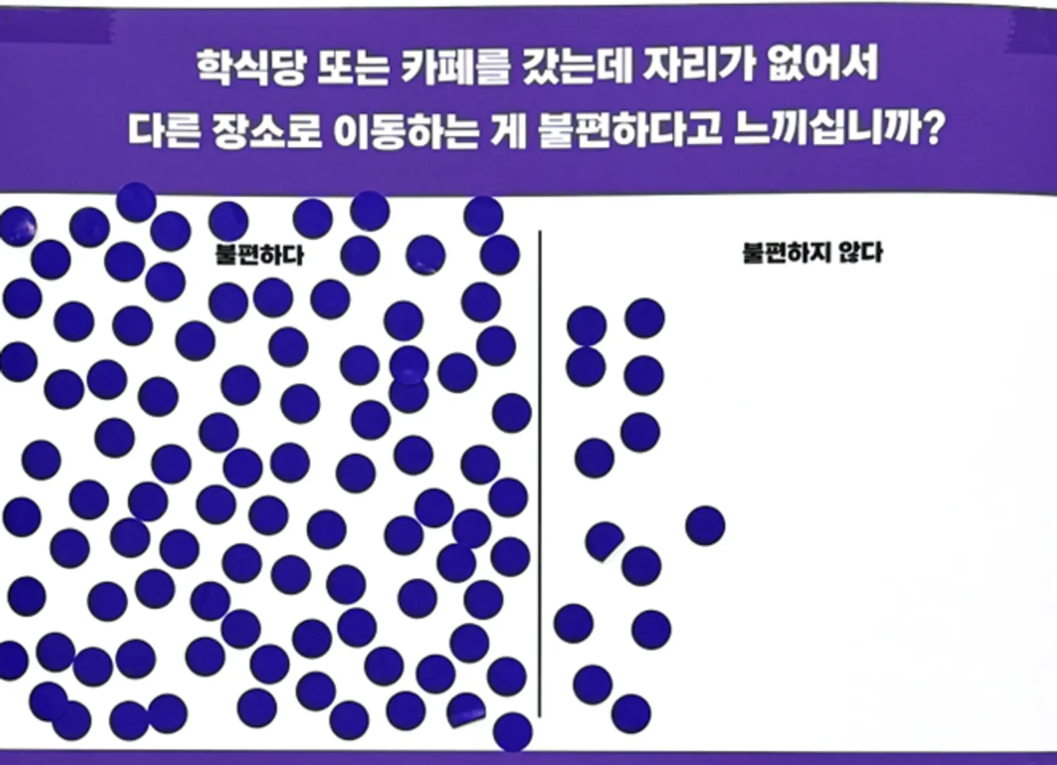 연세대학교 재학생 106명을 대상으로 시행한 설문조사에서는 약 88%가 학식당 혹은 카페에 자리가 없어 다른 장소로 이동하는 것이 불편하다고 답하였습니다.