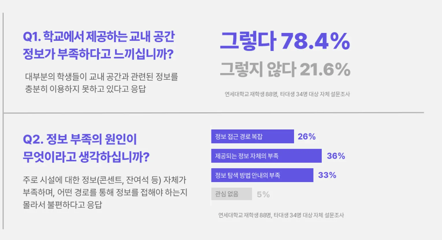 대학생 122명을 대상으로 설문조사를 시행한 결과, 78.4%가 교내 공간 정보가 부족하다고 응답하였습니다.