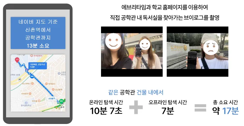 실제로 에브리타임과 학교 홈페이지를 이용하여 타 단과대생이 공학관 내 독서실을 찾아가는 브이로그를 촬영해보며 공간 탐색 시간을 측정해본 결과, 약 17분이 소요되었습니다. 이는 지하철 역에서 학교까지 오는 데에 걸리는 시간보다 더 길어, 현재 제공되는 정보만으로는 불필요하게 많은 시간이 공간 탐색에 소모됨을 확인할 수 있었습니다.