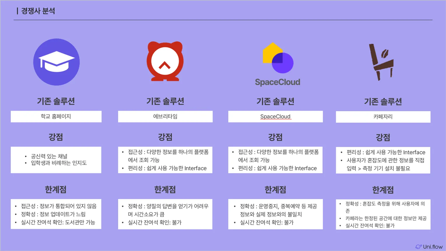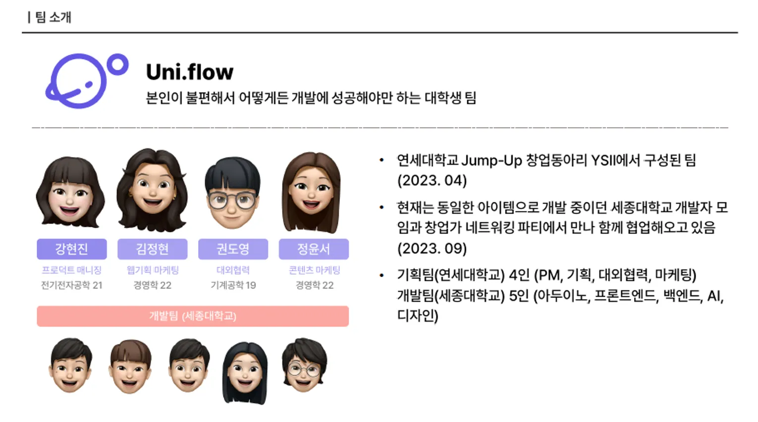 Uni.flow는 팀원 모두가 핵심 페르소나인 대학생으로 이루어져 있다는 강점을 가진 팀입니다. 따라서 대학생들이 겪는 Pain point에 대해 누구보다 잘 이해하고 있을 뿐 아니라, 사회 문제 해결에 대한 강한 열의를 가지고 있습니다.