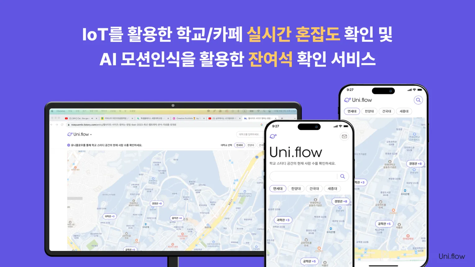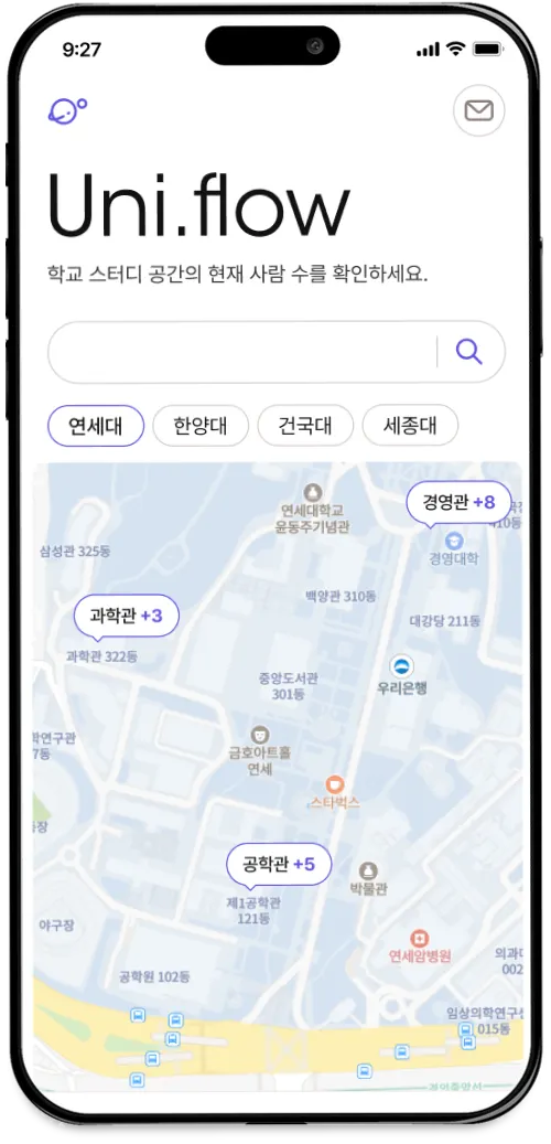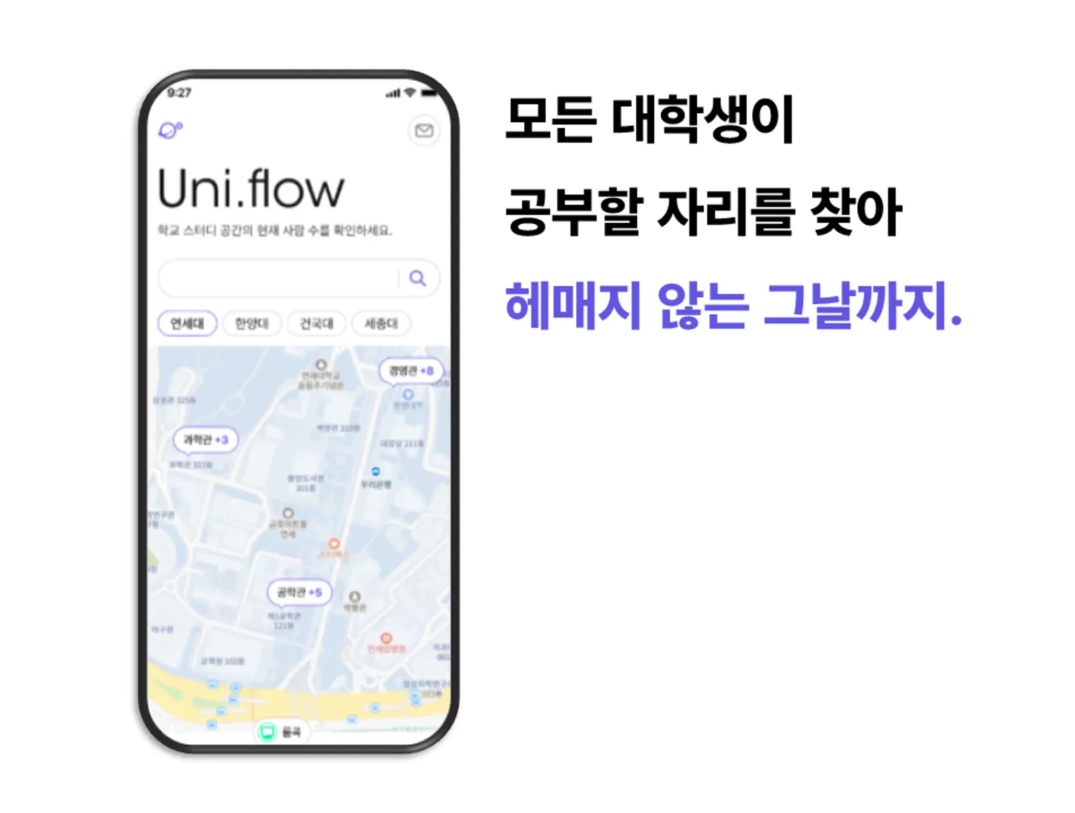 Uni.flow는 캠퍼스 내 학식당과 도서관, 라운지 등 공부 공간의 실시간 잔여석 및 공간 정보를 제공하는 서비스입니다.