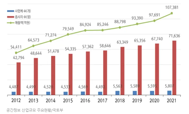 국토교통부에 의하면 “공간정보산업”의 전체 규모는 8조 8,798억원에 평가됩니다.