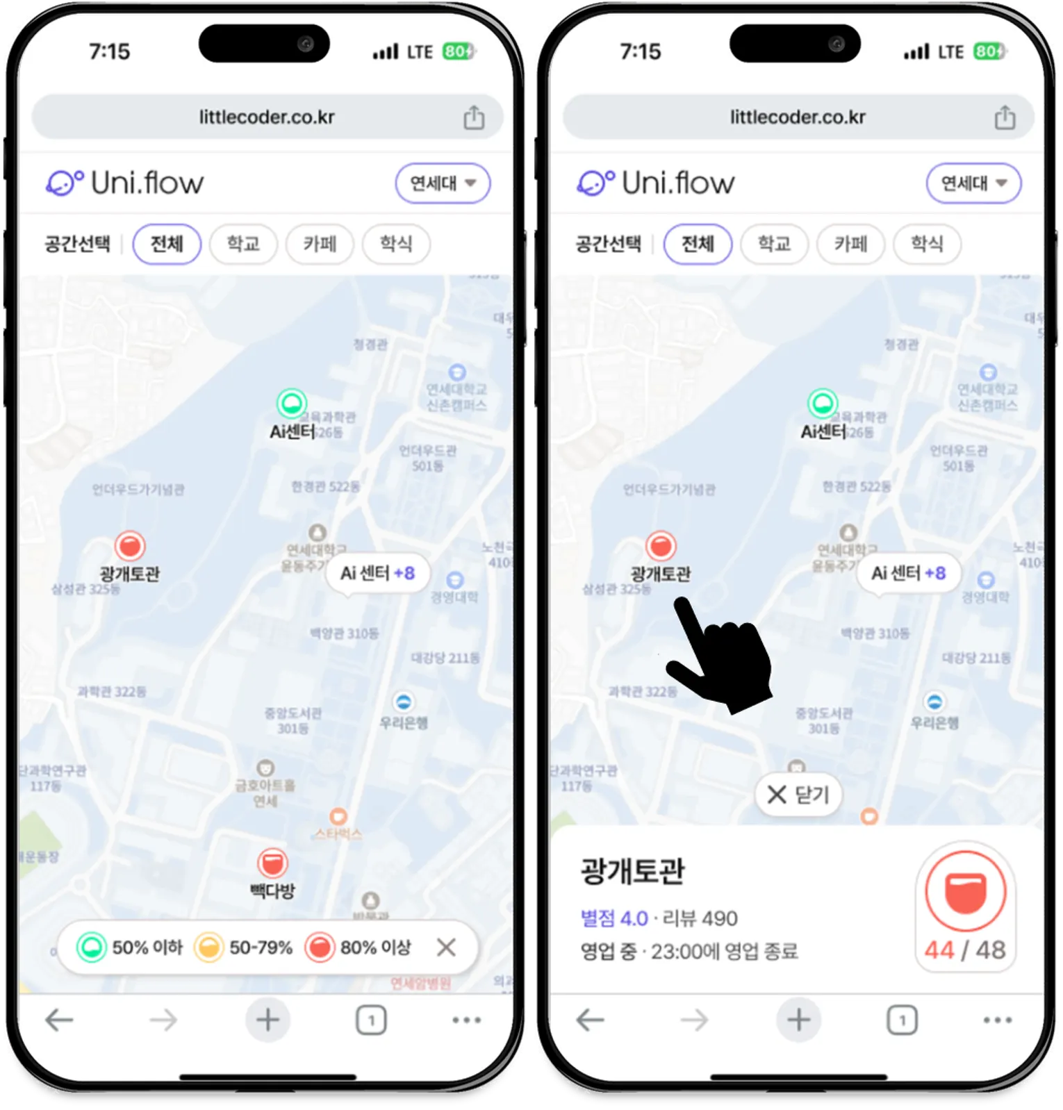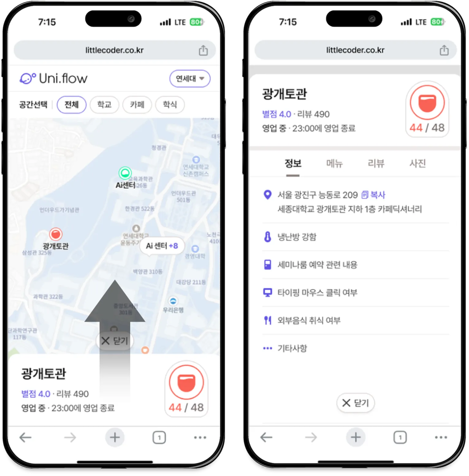 서울시를 넘어 전국 단위 대학교로 확장하여, 국내 대표 ‘대학교 실시간 공간 정보 사이트’로 자리매김할 계획입니다.