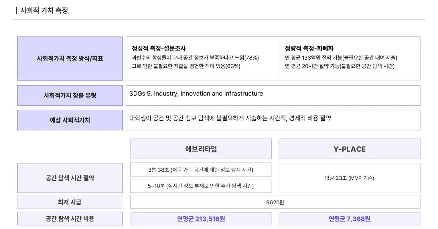 이렇게 여러 리서치를 진행하면서 Founder Market Fit으로 선정한 문제가 다수의 대학생들이 공감할 수 있는 사회 문제임을 확인하였습니다. 따라서 저희는 “교내 시설에 대한 정보 부족으로 대학생들이 불필요한 시간을 낭비하고 있다”를 사회 문제로 선정하여 이를 해결하고자 했습니다