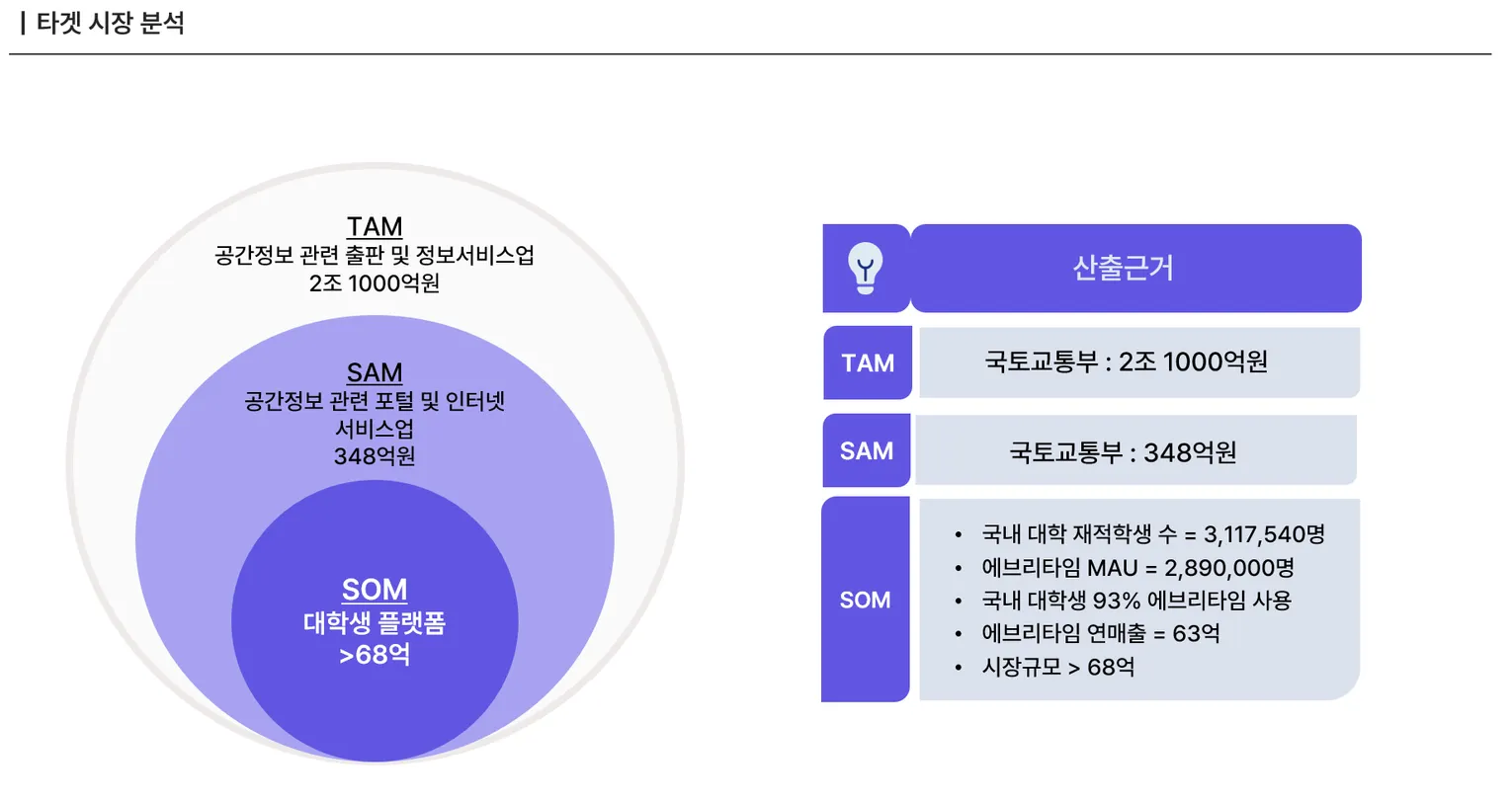 초기단계에 확보 가능한 시장인 대학생 플랫폼의 시장규모는 해당 시장의 Key Player인 “에브리타임”의 연매출을 바탕으로 추산됩니다.