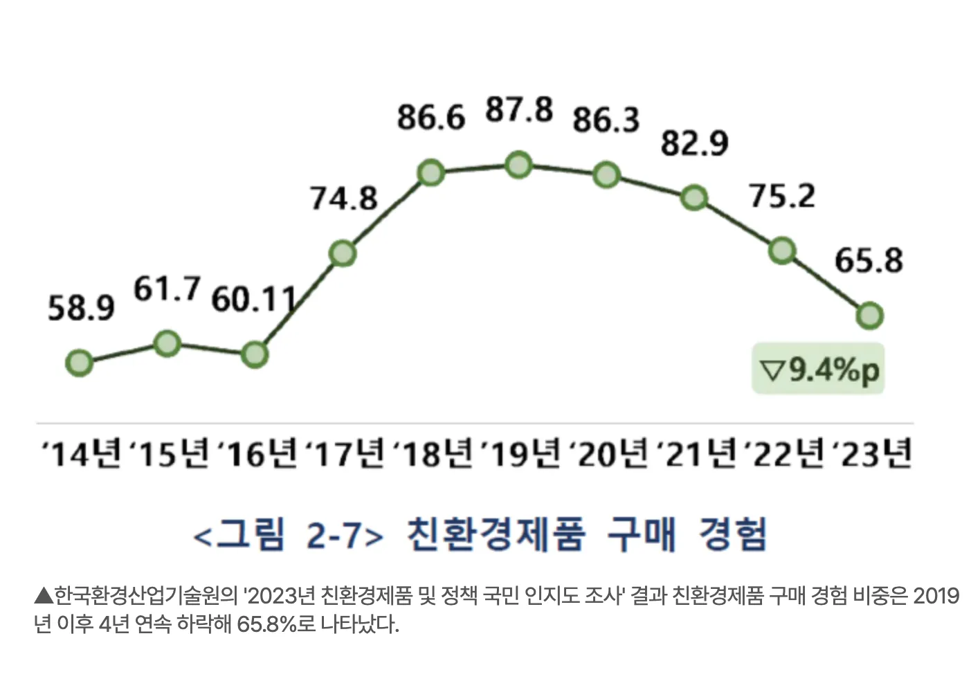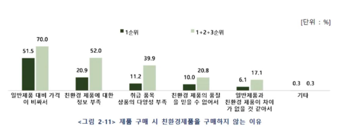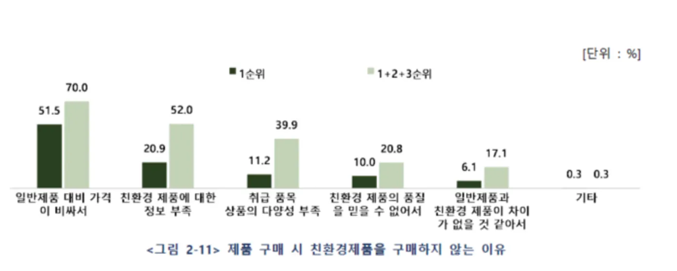 (우리나라) 소비자 입장: 가격이 비싸서 친환경 제품과 환경 문제에 관심은 많지만 실제로 친환경 제품 구매로 이어지지 안고 있음