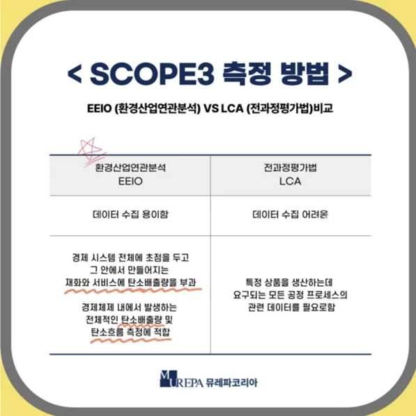 EEIO: 세무·회계 데이터를 활용한 환경산업연관분석(EEIO)으로 LCA의 시간적 한계, 데이터 수집 어려움 등의 문제로 등장한 현실적 대안으로 회계 바탕으로 탄소 데이터를 측정함.