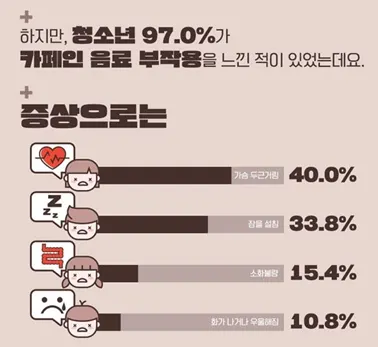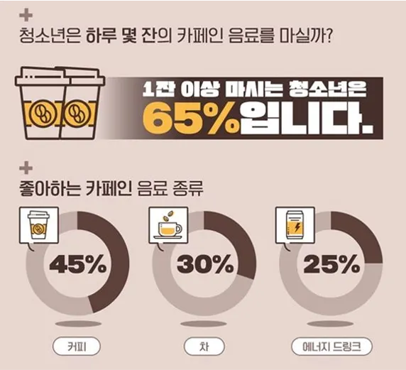 전국 800개교 중·고생 약 6만 명을 대상으로 한 ‘청소년 건강 행태조사’에서 응답 청소년의 22.3%는 주 3회 이상 고카페인 음료를 섭취한다고 답했다. 주 1∼2회 마신다는 응답도 26.4%나 됐다.(출처 : 질병관리청 청소년건강행태조사, 2023)